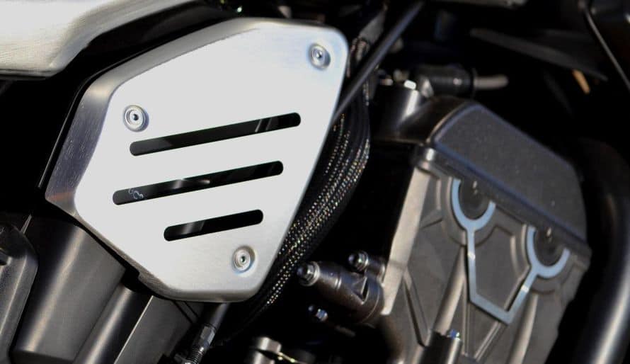 Les écopes de radiateur et les platines repose-pieds ont été traitées en noir satin.