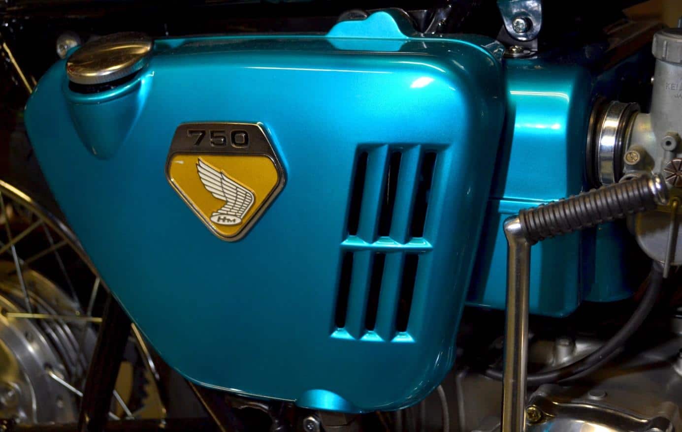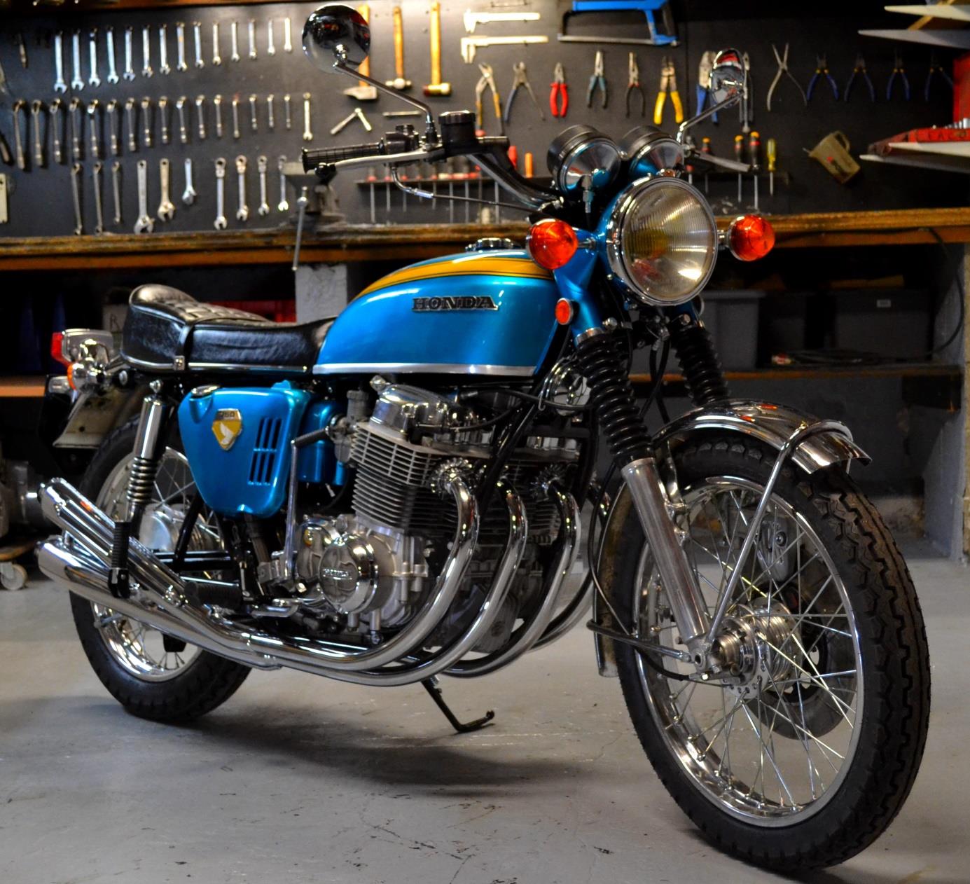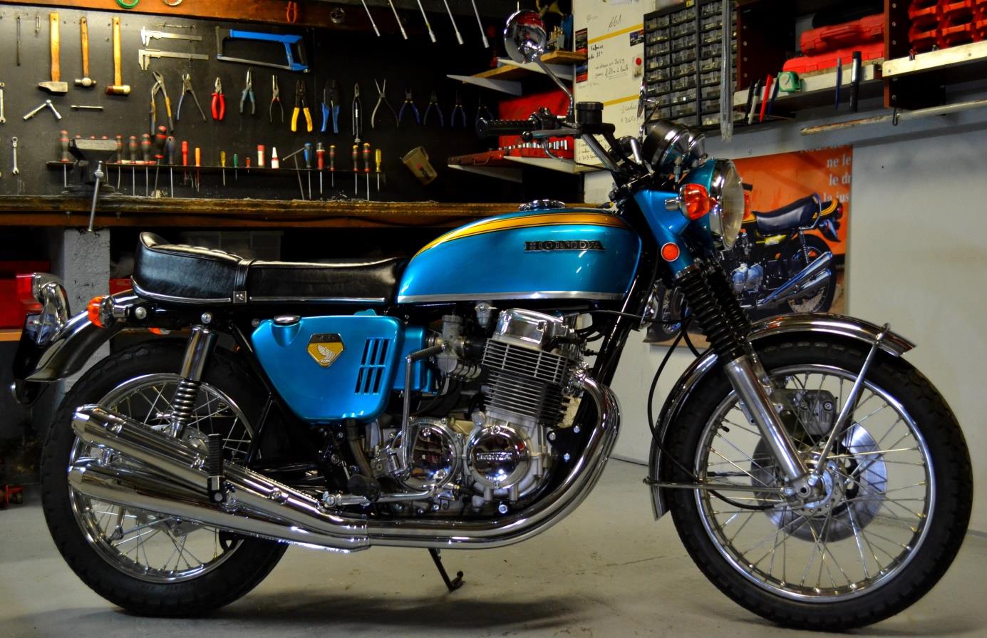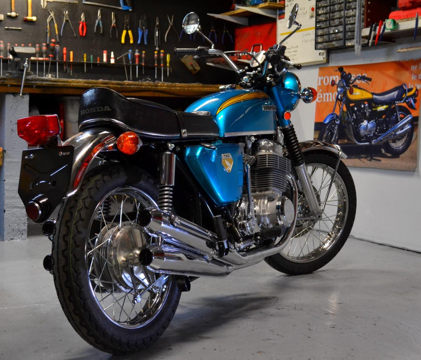 La carrosserie a été repeinte en coloris Candy Blue Green : la CB 750 1969 n’a pas été commercialisée dans ce coloris en France.