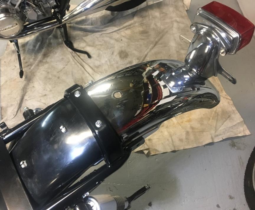 Le garde-boue AR chromé, la partie en plastique, le support et le feu AR sont ceux d’origine de la moto.