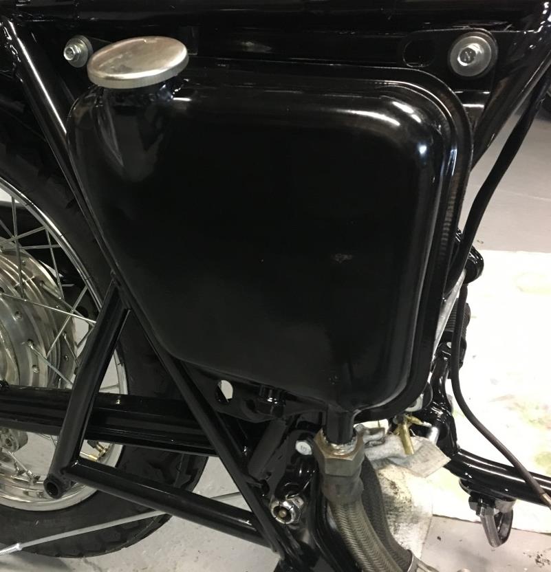 Les durits d’huile reliées au réservoir sont les durits d’origine de la moto : elles sont tressées et de couleur blanche.