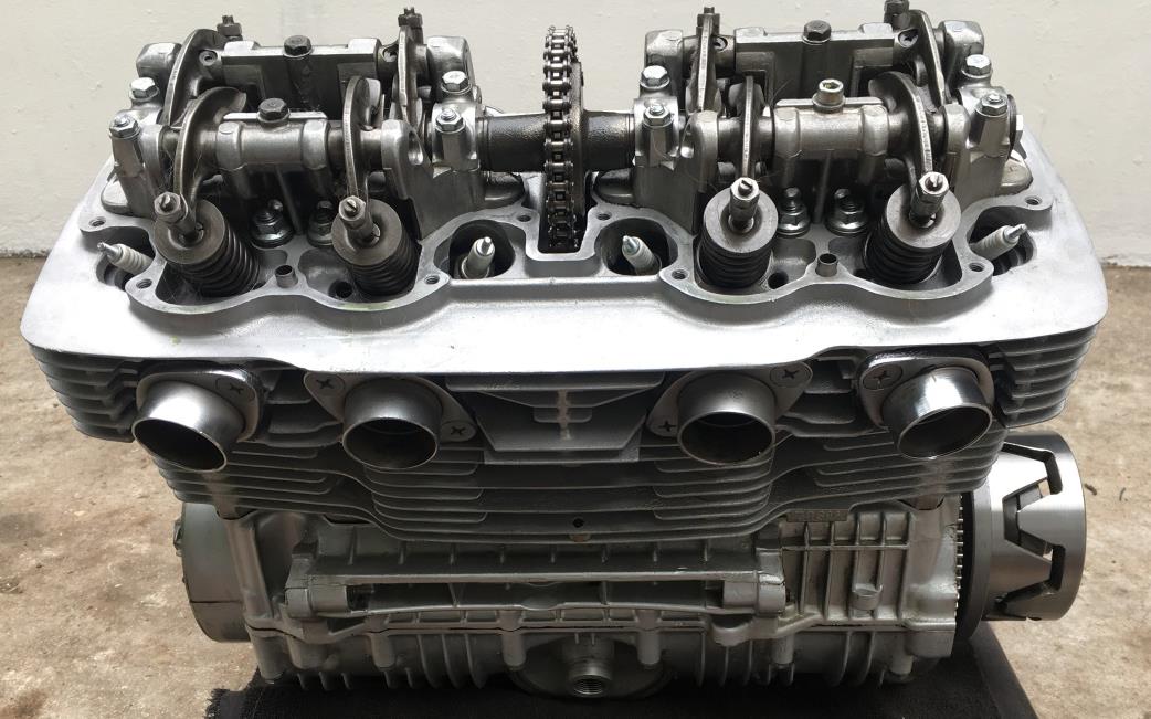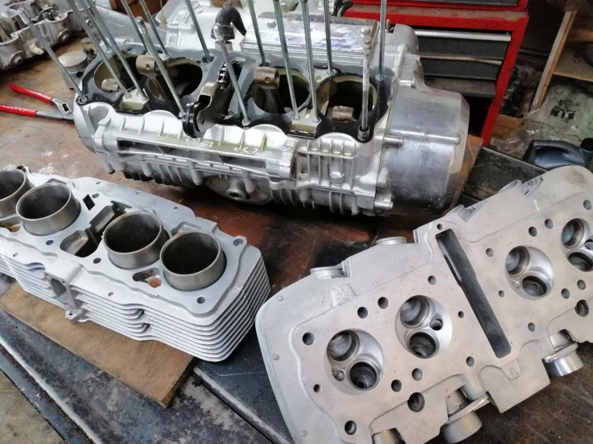 Compte tenu du faible kilométrage d’origine de la moto, les cylindres ont été déglacés et remontés avec des pistons en côte d’origine (+ segments + clips + axes neufs).