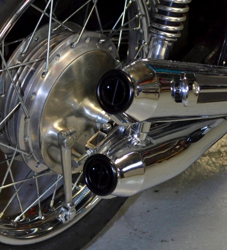 Conformément au modèle CB 750 de 1969, les pots ne sont pas siglés et sont équipés de grosses chicanes.